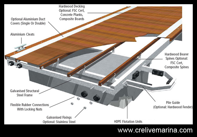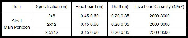 TECHNICAL DATA LIVE LOAD: 250-400 kg/m2 FREE BOARD: 0,55 -0,60 m DEAD LOAD: 310-450 kg/m MAIN STRUCTURE: Galvanised steel FLOAT: HDPE or FRP float with polystyrene core DECKING: Hard wood or WPC